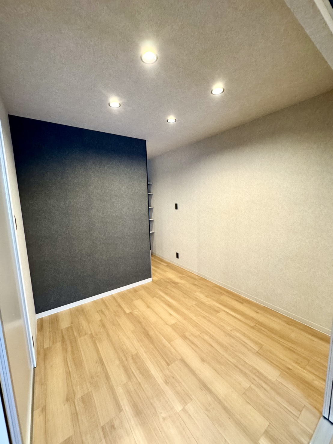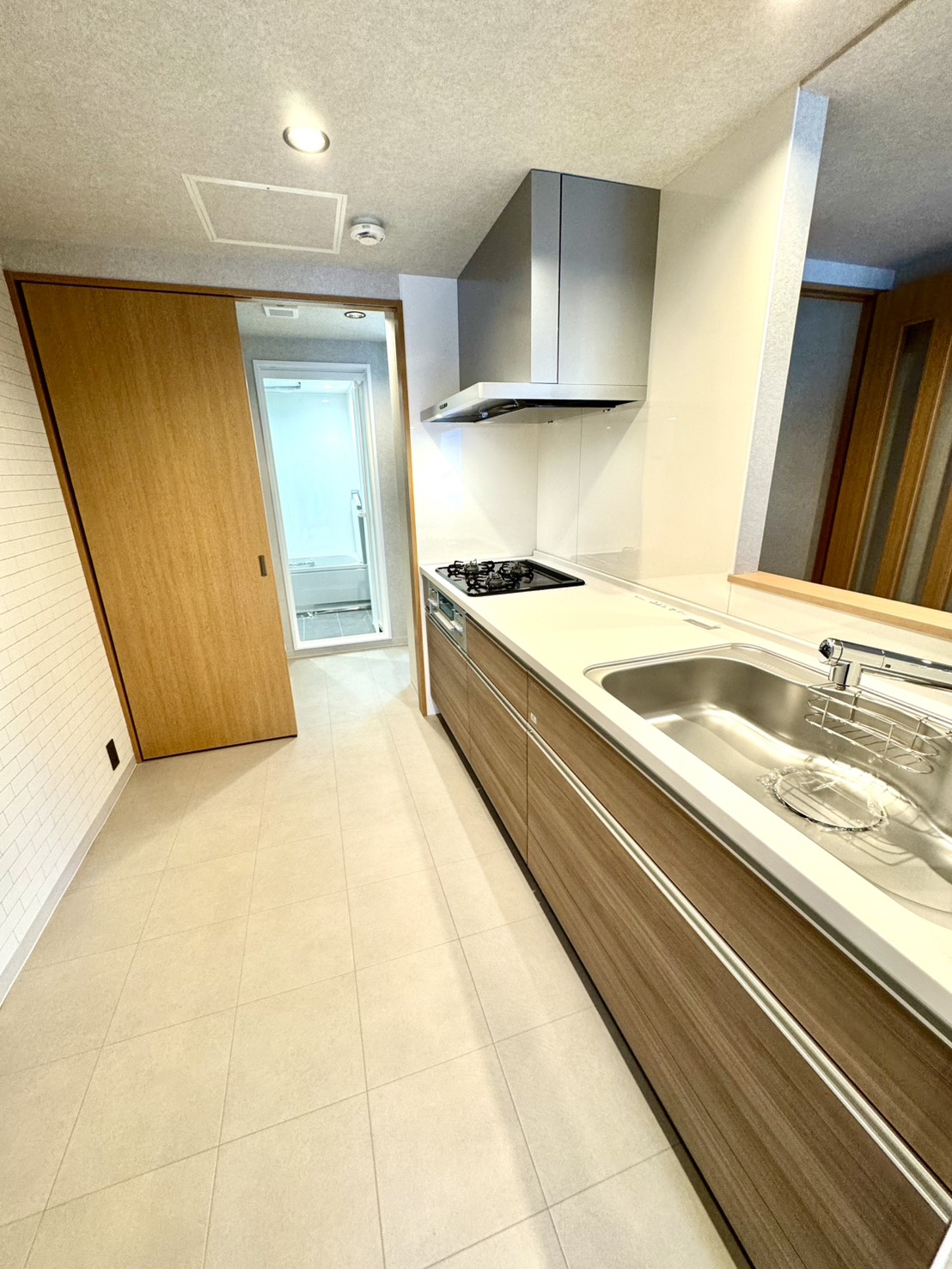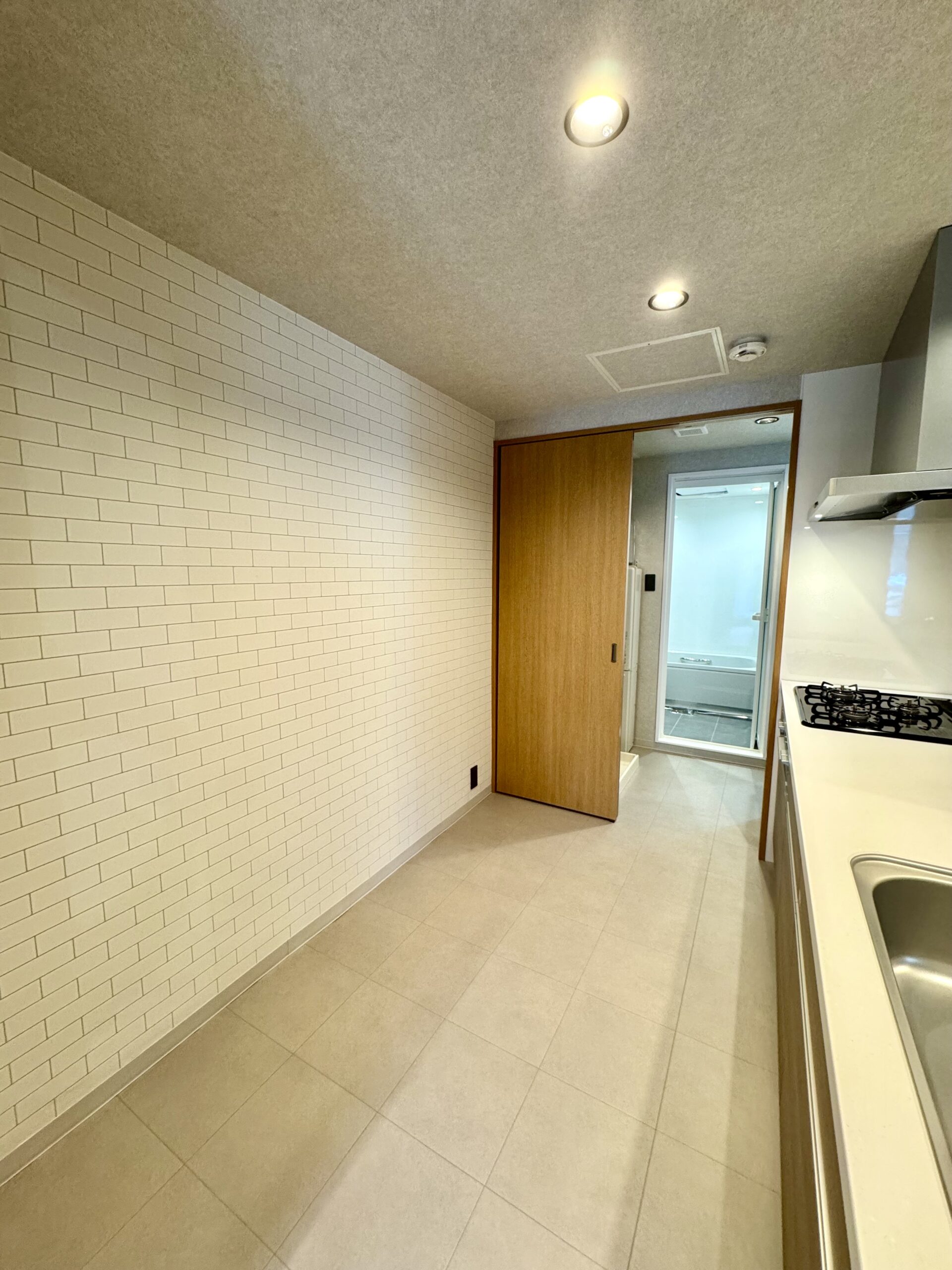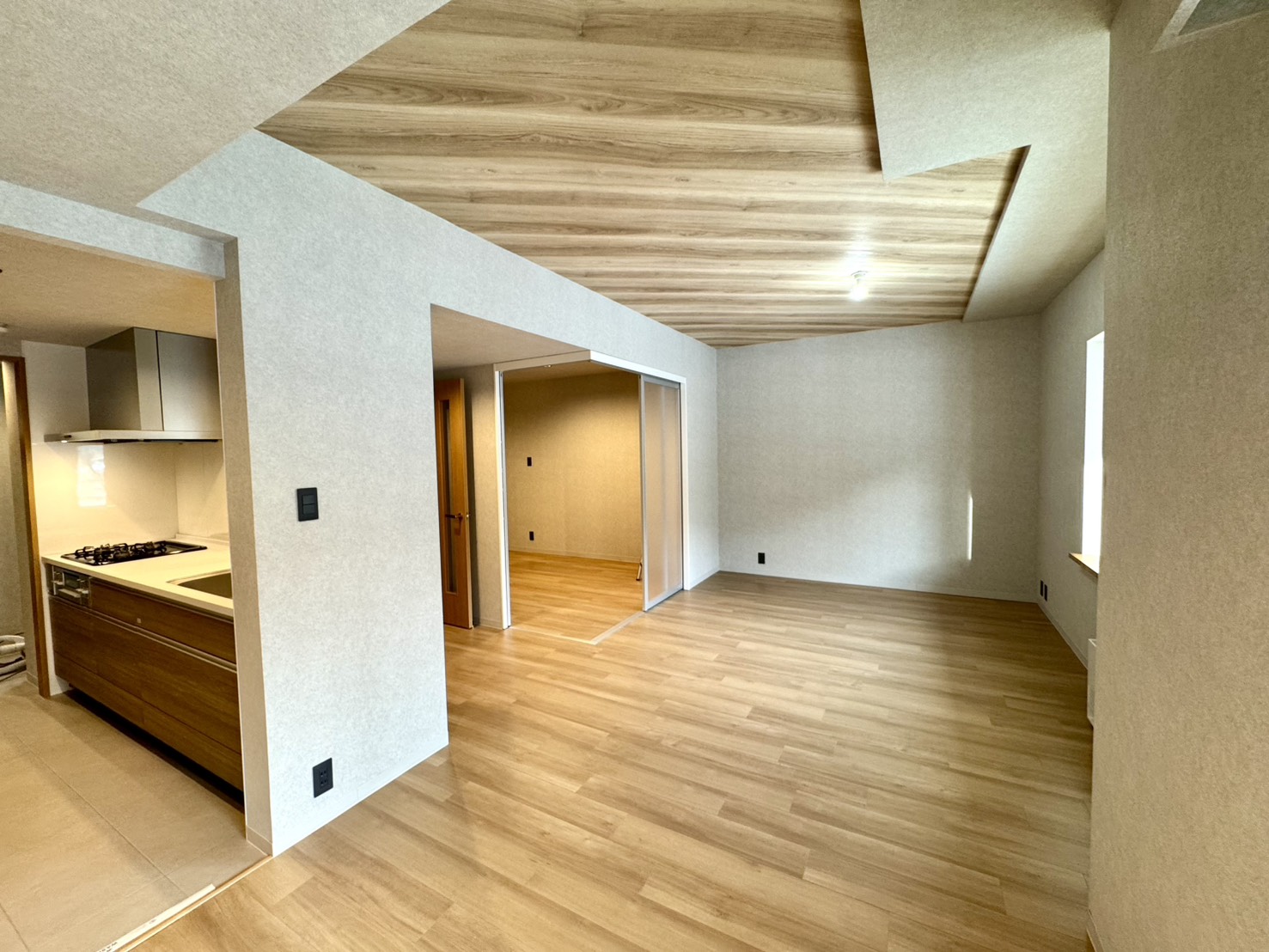 壁紙を明るいグレー調・床および天井を同一の木目に施工。またキッチン壁部分を一部取り壊しLDKに一体感をもたせました。